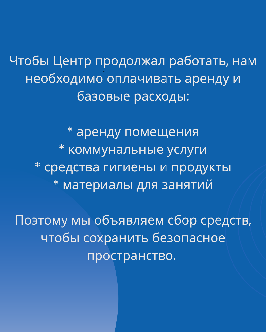 Чтобы центр мог работать регулярно и без перерывов, нам необходимо стабильное и безопасное помещение. К сожалению, аренда жилья остается очень высокой.
